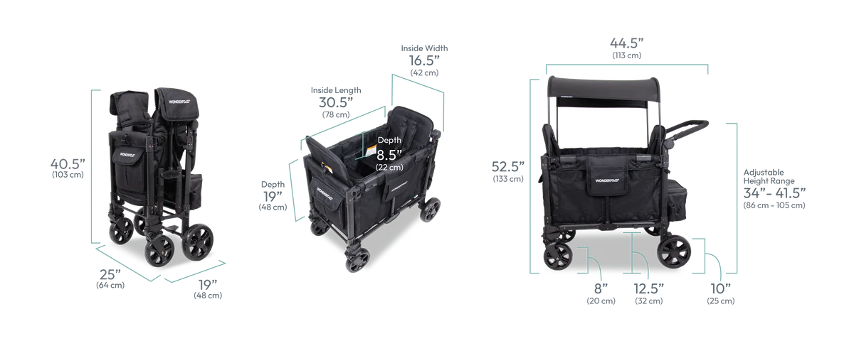 所有 WonderFold 嬰兒車均配備全地形輪胎,可應對人行道、草地和不平坦的地面。如果您需要更難駕馭的路面,可以升級到配備全地形 XL 輪胎的 Luxe Pro。